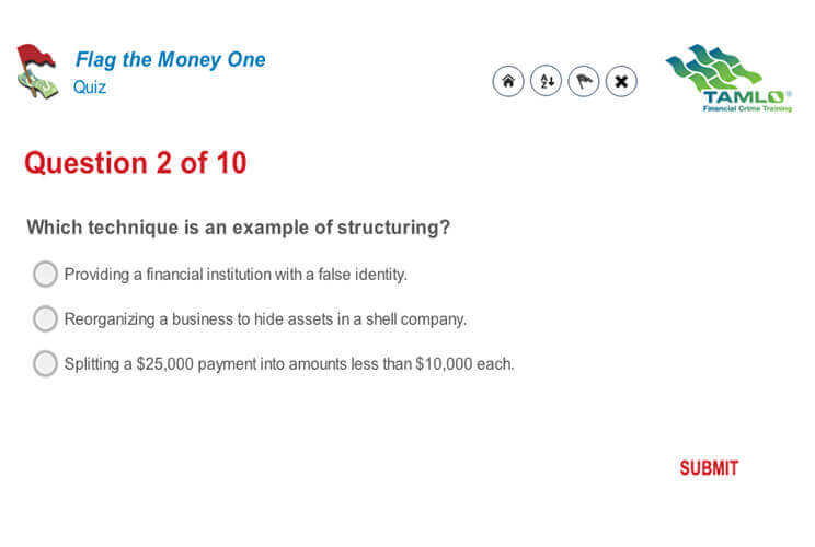 Each Flag the Money quiz question draws on the participant’s understanding of one of the key topics from the course. If someone fails to pass on their first attempt, they can they take it again, and the answer choices will be in a different order. Compliance officers can be confident that employees who pass have a foundational level of understanding of the main topics.