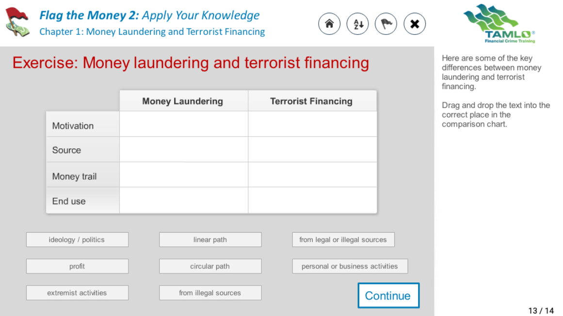 Flag the Money 1  is AML training for MSBs that teaches employees and agents how money laundering and terrorist financing work and what they can do to detect and report suspicious transactions.