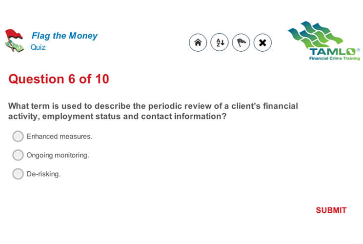 Each Flag the Money exam question draws on the participant’s understanding of one of the key topics from the course. If someone fails to pass on their first attempt, they can they take it again, and the answer choices will be in a different order. Compliance officers can be confident that employees who pass have a foundational level of understanding of the main topics.
