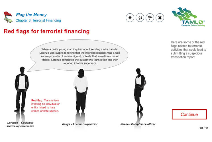 We’ll be glad to work with your compliance team to produce a customized version of Flag the Money that fits your needs and your budget. Tamlo’s staff is here to provide timely support for you and your organization throughout the training cycle. Please contact us to discuss your customization needs.