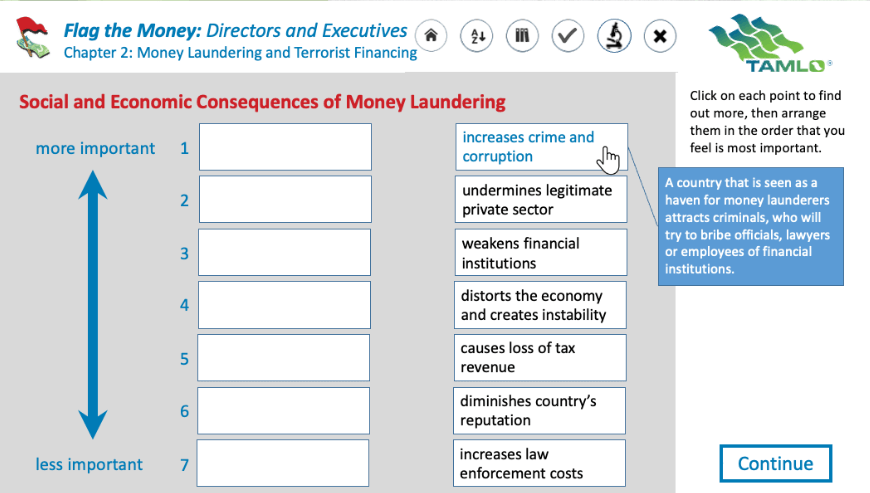 The friendly, accessible style of this Flag the Money™ course gives the board of directors and senior management a high-level overview of AML compliance to ensure the organization is identifying and reporting financial activity that might be linked to money laundering or terrorist financing. The streamlined content includes the following five elements: